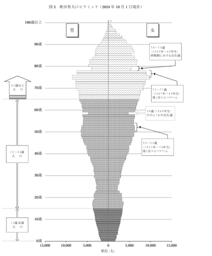 例えば、下記の秋田県のように、現役世代の人口が他の年代よりも減っている場合は、地元に良い働き口がなく、都市部へ若い人が流出している可能性が高いため、要注意です。